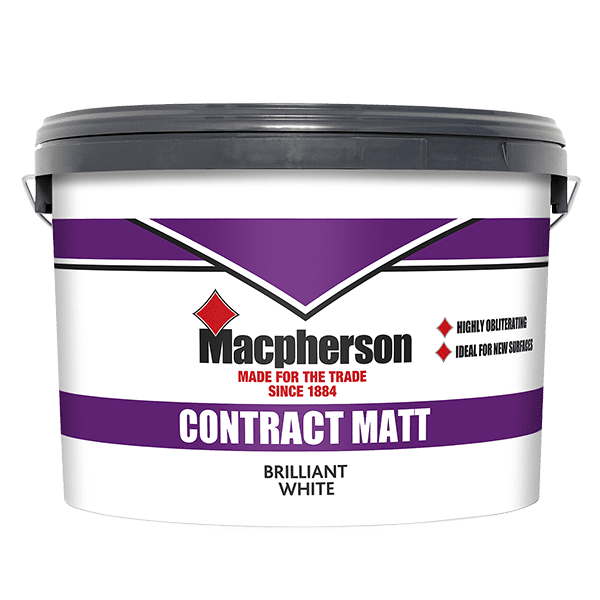 Macpherson Contract Matt water-based emulsion paint has high obliterating feature that allows it to be used on new plaster where the surfaces can dry quickly. A great combination of quality and value for money. It has good opacity, is economical, and can be used on new plaster or refurbishment.