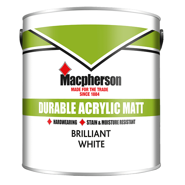 Macpherson Durable Acrylic Matt emulsion is a hard wearing emulsion for interior walls and ceilings specially formulated to allow scuffs and stains from "high traffic" areas to be easily washed away. With built in stain and moisture resistance, it helps to keep walls looking cleaner for longer. LEED and BREEAM accredited