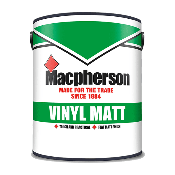Macpherson Vinyl Matt Emulsion paint produces an attractive finish that is tough and practical. Water-based vinyl matt is the ideal choice for most interior walls and ceilings where a fashionable flat matt finish is required. Touch dry within 3 hours it can cover up to 15m2/litre.