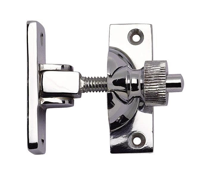 The Union Brighton sash fastener is a traditional non-locking catch designed for use on sliding sash windows. It's used to pull the two sashes together at the meeting rail, which helps to reduce drafts and increase security. The fastener is operated by unscrewing a knurled nut on a sprung lever arm. Once the arm is lifted and swung out of the way, the window can be opened. To secure the window, the arm is re-engaged with its keep and the nut is tightened, creating a firm and secure closure. Polished Chrome finish