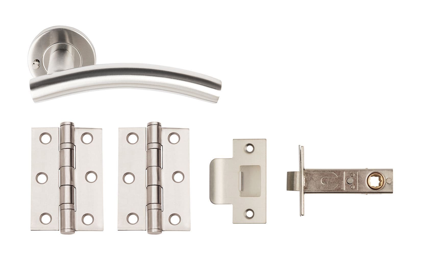The Union door pack is a comprehensive solution for internal doors.It includes stylish lever handles, a 63mm standard or privacy latch, and 76mm ball-bearing hinges for smooth operation. A 5-year guarantee provides peace of mind. Satin Stainless Finish